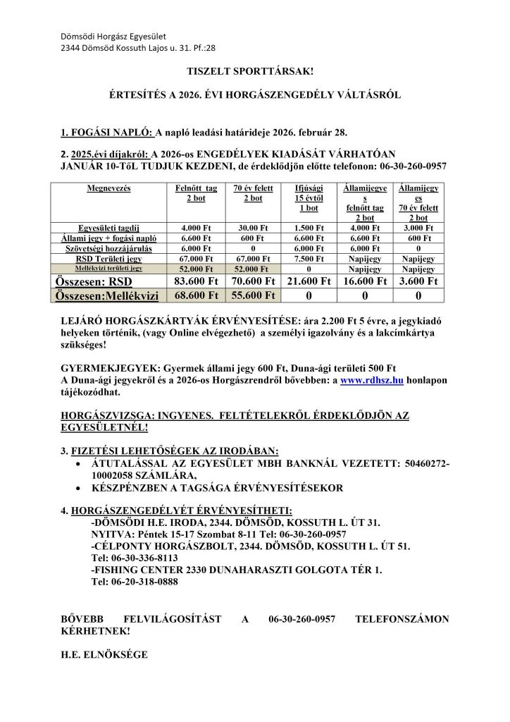 Értesítés a 2026. évi horgászengedély váltásról Tájékoztatjuk kedves tagjainkat, hogy a 2026 évi Horgászrend illetve jegyár nem változott a 2025-ös évhez képest! További információ az alábbi linken található a www.rdhsz.hu honlapon található.